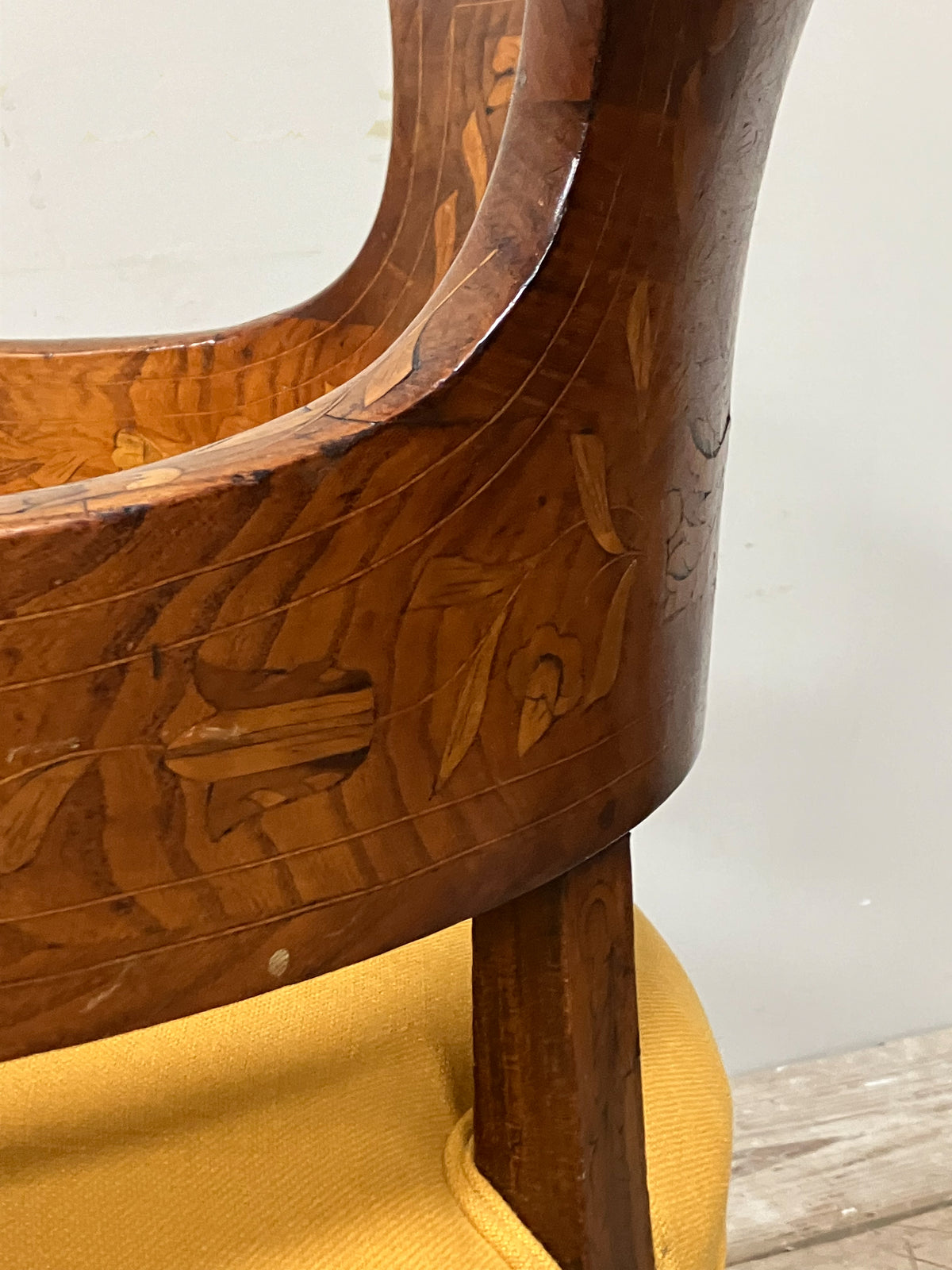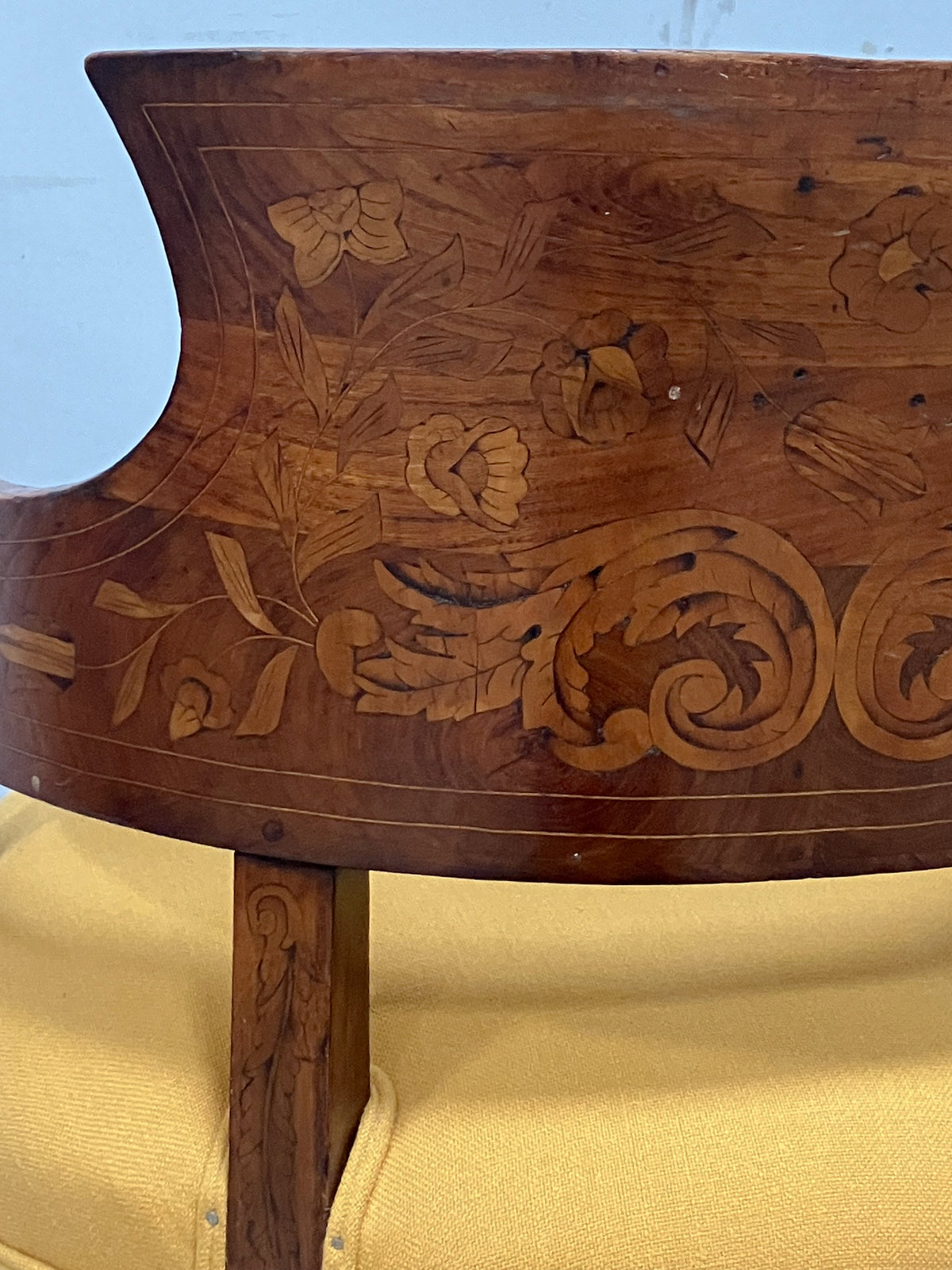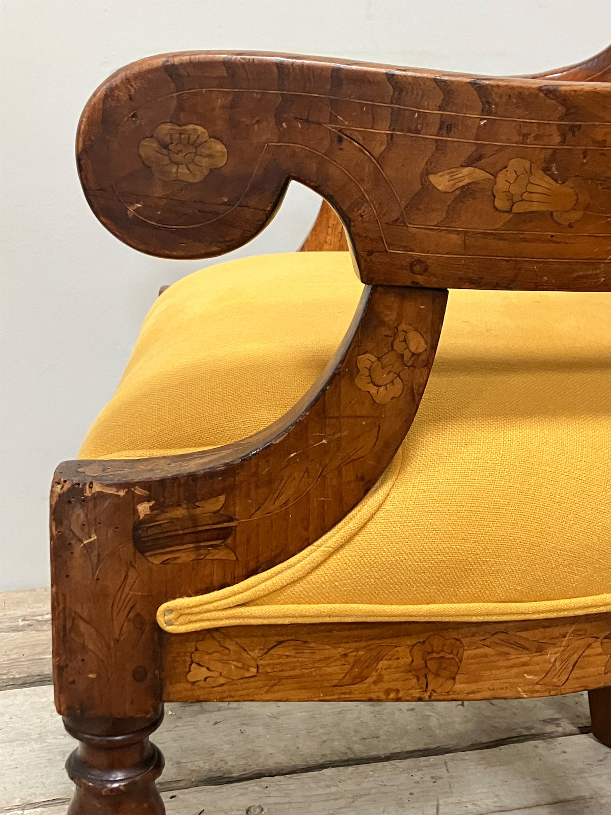 With an upholstered, sprung seat recovered in a mustard yellow linen by Tinsmiths.