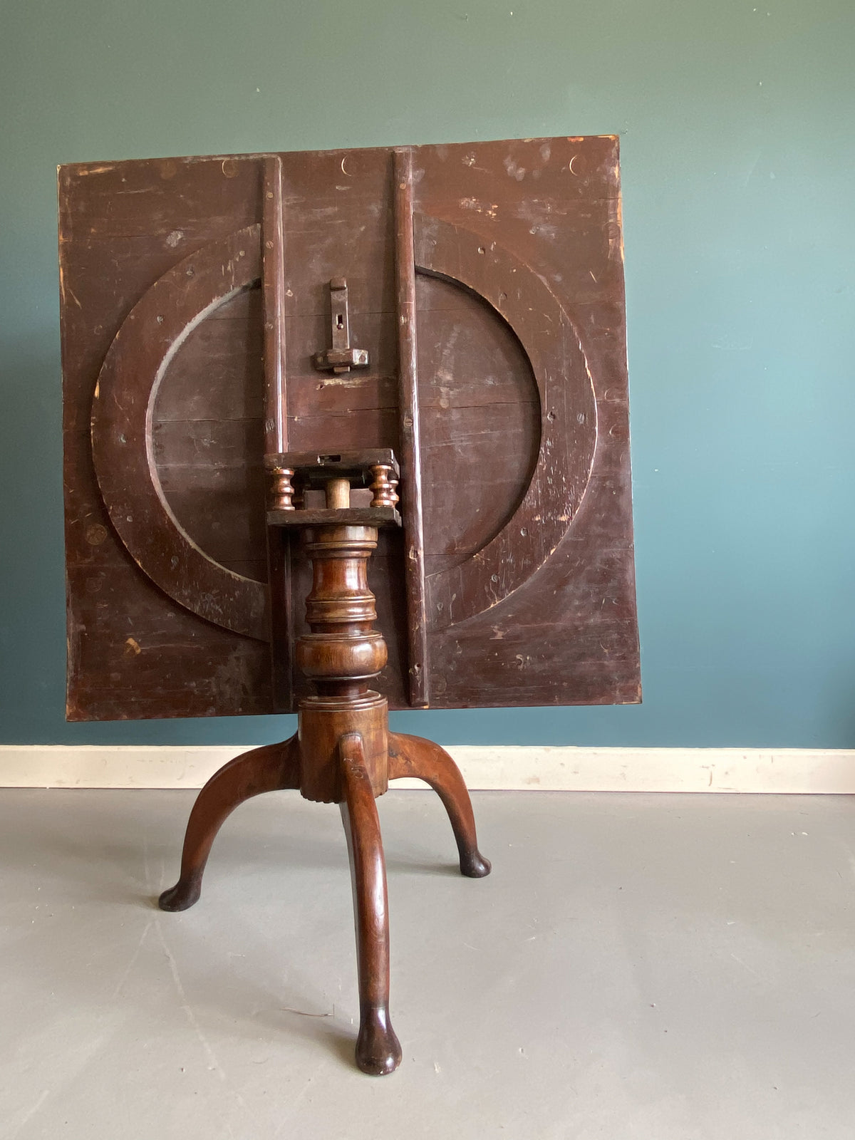 Yew base, turned column support on three down swept legs